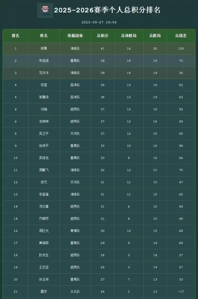 个人成绩,荔湾混双李莹/邹穗添发挥出色,5局5胜全取10分。为此轮全部选手中3个10分满分之一(另2个在海珠)。此轮过后,荔湾女子选手李莹积38分,一举攀升至女子榜第1,与搭档邹穗添同积38分排名个人总榜第4,成绩相当优秀,又一颗璀璨女星冉冉升起。天河队吴卫平/李杰发挥稳定,4胜1负取8分,吴卫平个人总榜37分排名第8,冲击冠军第一集团。