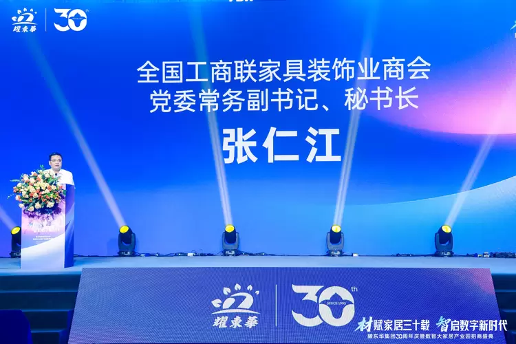 全国工商联家具装饰业商会党委常务副书记、秘书长张仁江先生致辞,他在致辞中提到“从专注饰面板生产到提供板式家具集成材料,再到如今积极运用互联网思维打造数字化大家居产业平台,耀东华的每一次转型升级都彰显出其非凡的战略远见与蓬勃的创新活力。”