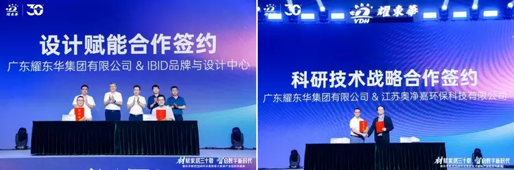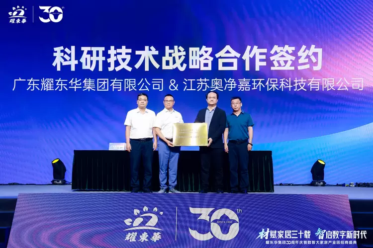 活动现场,广东耀东华集团还与江苏奥净嘉环保科技有限公司官宣成立“新型饰面材料联合研发中心”。