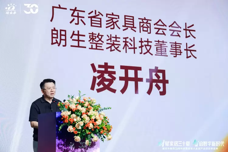 随后,广东省家具商会会长、朗生整装科技董事长凌开舟先生上台致辞,并高度评价了耀东华三十年来对家具产业创新发展作出的重要贡献。