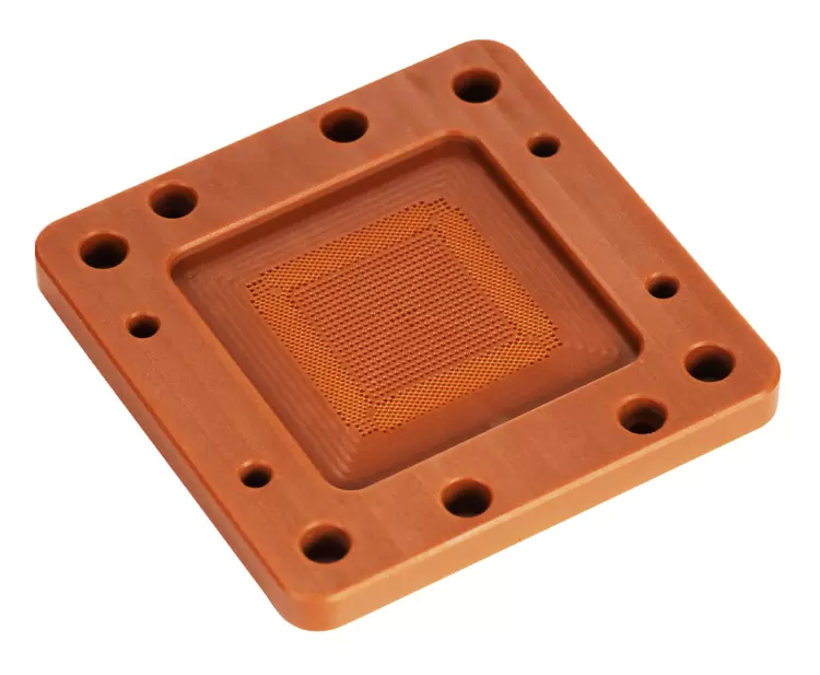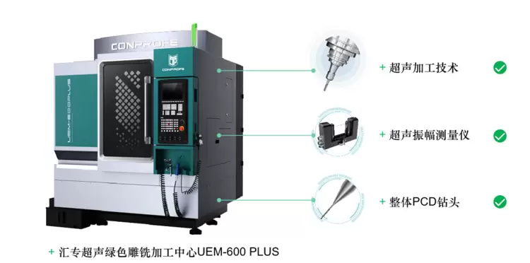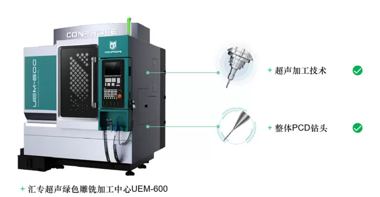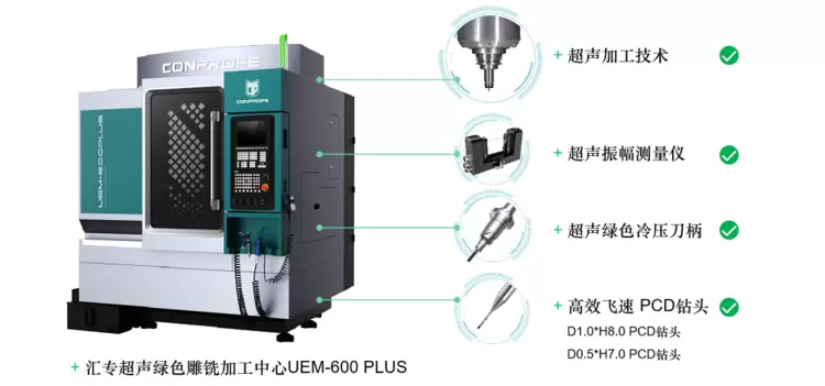 硬度高达HV3,150的CVD碳化硅喷淋盘具有高硬脆的难加工特性,因加工周期长、加工成本高、工件易崩缺、刀具易损耗等问题长期依赖国外进口。汇专通过超声绿色雕铣加工中心UEM-600 PLUS+超声加工技术+超声振幅测量仪+超声绿色冷压刀柄+高效飞速PCD钻头的组合方案,将D1.0/D0.5mm CVD碳化硅喷淋盘阶梯孔的单孔加工时间从11分25秒缩短至5分58秒,加工效率提升47.8%,刀具寿命提升160%,加工成本降低50%,显微镜放大至50倍检测,孔口崩边量≤0.02mm。
