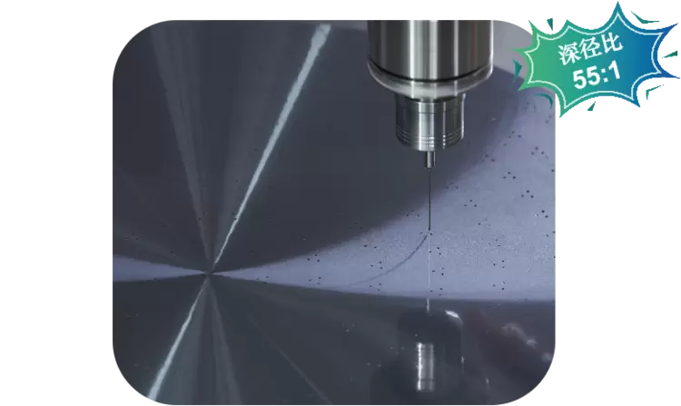 单晶硅是典型的硬脆性材料,加工中容易产生崩缺问题,导致工件报废率高,而对于孔深径比高达55:1的单晶硅曲面电极,更是进一步增加了加工难度。对此,汇专采用超声绿色雕铣加工中心 UEM-600+超声加工技术+整体PCD钻头的配套解决方案,对单晶硅曲面电极进行钻孔加工,可连续加工超过1,000个D0.45x24.75mm的超深微孔(深径比55:1),入口处目视无崩边,孔真圆度达0.003mm,孔壁粗糙度Sa从6.540μm降低至0.013μm,降低99.8%。
