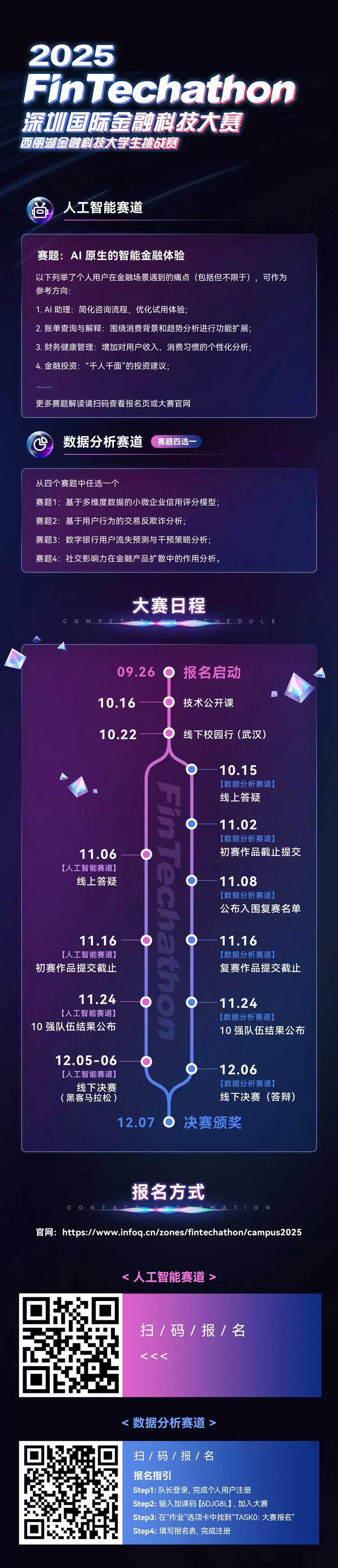 为了满足金融科技产业技术创新及人才需求,更好地推动金融科技产业发展,由深圳市地方金融管理局进行战略指导,深大微众金融科技学院、微众银行、InfoQ 极客传媒、狗熊会等多方联合举办的“2025 深圳国际金融科技大赛(FinTechathon)——西丽湖金融科技大学生挑战赛”(下文称“大赛”)于9月26日正式开赛。