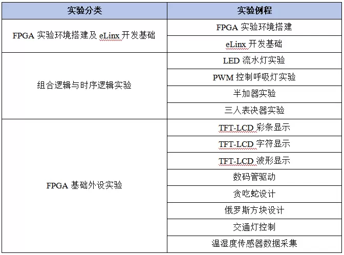 教学实验主要包括:FPGA实验环境搭建与eLinx开发基础、组合逻辑与时序逻辑实验、FPGA基础外设实验。
