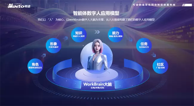 以workbrain 数字人大脑为支撑,从角色、形象、知识、能力、任务、社区六个维度构建智能体,实现深度互动与持续价值创造。