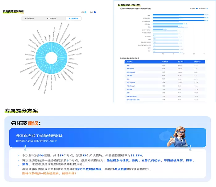 另一方面,APP载入想象力智能中高考首创的智能导学系统,通过实时追踪学生的解题数据(如正确率、错误类型)、学习时长分布、知识点掌握深度等多维度信息,精准定位学生的三大提升空间。基于学情,系统为每位学生定制个性化学习方案,不仅明确 “学什么”,更规划 “怎么学”,让学习更有方向、更加高效。