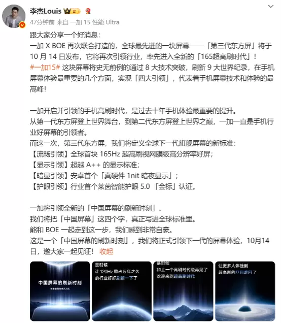 一加与京东方推出史上最强东方屏 10 月 14 日正式发布