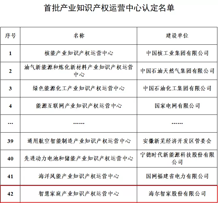 - 海尔获批筹建的家电业首个知识产权运营中心正式被国家认定