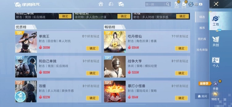 绿洲启元的魅力,来自于其源源不断的创意玩法供给,平台内划分工坊和共创两大内容板块,已上线的玩法和地图数量总和超过15万个。