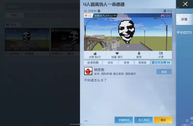 共创模块则更加凸显「即时创意、快速实现」的特点,可以玩到《科目二》《318之路》《4人逃离伪人一命速通》《铃芽之旅》等爆款玩法。其中《4人逃离伪人一命速通》玩法,以时下流行的“伪人”传说为背景,营造出被未知生物追逐的紧张氛围,增强了沉浸感和逃脱的紧迫感,累计游玩数已突破2.2亿,游戏内玩家评论超2.2万条。