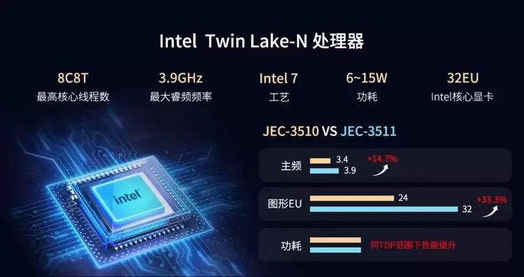 JEC-3511通用型工业BOX整机搭载全新一代英特尔®新一代 Twin Lake-N 处理器,相较Alder Lake-N平台,AI推理性能提升40%。采用先进Intel 7制程工艺,在主频提升至3.9GHz的同时,整体功耗降低约15%,实现性能与能效的双重优化。