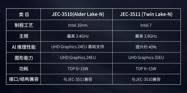 相较前代主力机型JEC-3510,JEC-3511支持PIN对PIN兼容,实现零成本替换升级,助力用户在工业自动化、边缘AI、工业网关等应用场景中轻松完成性能跃迁。