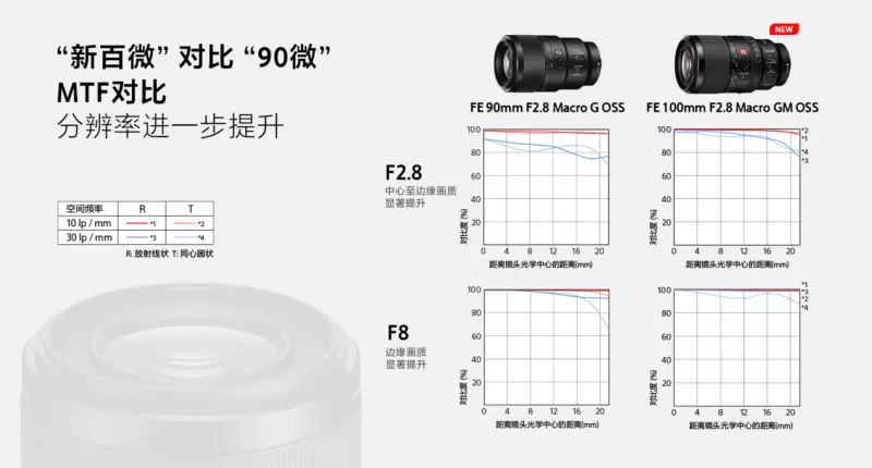 光学设计上,FE 100mm F2.8 Macro GM OSS搭载了两枚XA(超级非球面)镜片和两枚ED(低色散)镜片,画面中心到边缘均保持了高分辨率的画质表现,并能有效抑制色散与其他不良像差。 对比前代微距镜头4,全开光圈F2.8及F8光圈下的分辨率都有显著提升。