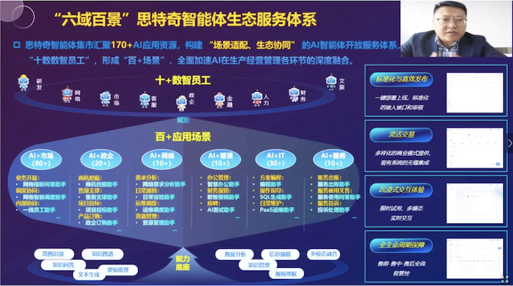 思特奇智能体产品和服务体系,以客户价值为核心,覆盖运营商全业务场景,具备快速搭建、高效部署、价值提升等能力优势。本次发布上,思特奇AI技术专家实际演示了AI+网格营销、AI+政企DICT场景的智能体能力和效果。