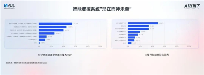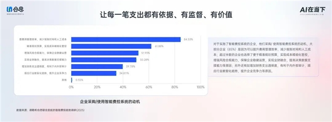 从应用趋势来看,62%的企业使用智能费控,初期多以降本增效为目标。而随着合思等优秀厂商持续打磨产品,智能费控已能从流程贯通、降本增效,逐步向价值链上游延伸——比如在差旅报销、招待费、市场活动等企业舞弊高发领域,助力风险防控。此外,部分企业即便已上线系统,但如果缺乏有效的技术手段进行数据分析与挖掘,相关数据也难以有效释放价值。现在,借助先进的智能费控系统,相关数据能够有效利用,如为预算管控分析、趋势预测提供支撑,帮助企业更加科学地分配和使用资源。