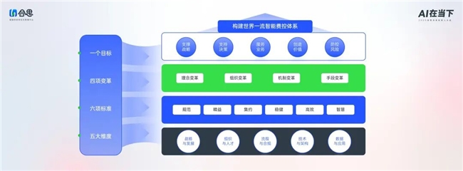 借用世界一流财务管理体系框架进行总结,我们提出 “构建世界一流智能费控体系” 。其中,体系上层核心是大家熟知的“1455”文件内容 —— 即未来需强化的五项基本功能定位与需推进的四项变革;而要支撑体系落地,还需系统性规划组织机制、人才培养、流程优化和技术架构,以构建一个目标明确、步骤清晰、可执行性强的智能费控发展蓝图,从而实现从局部优化到全面赋能的跃迁。