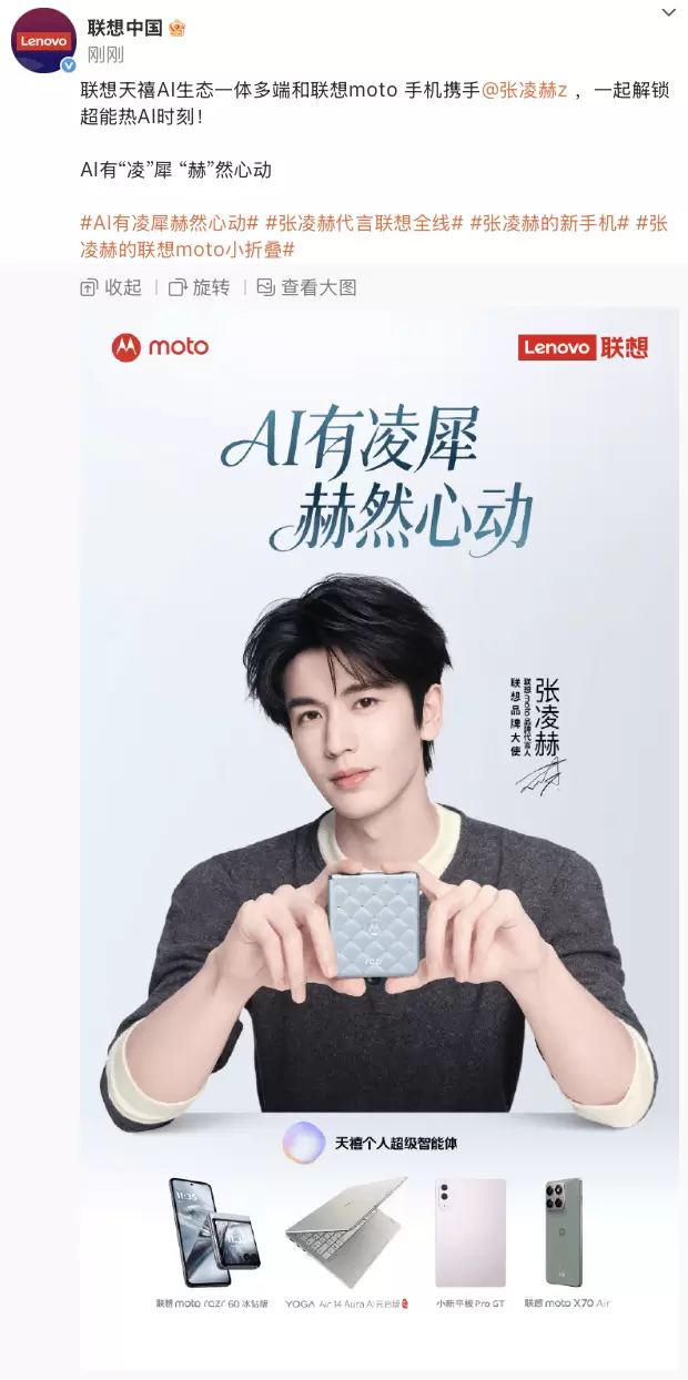 联想官宣联想品牌大使及联想moto品牌代言人张凌赫,共同诠释“AI有凌犀”新表达