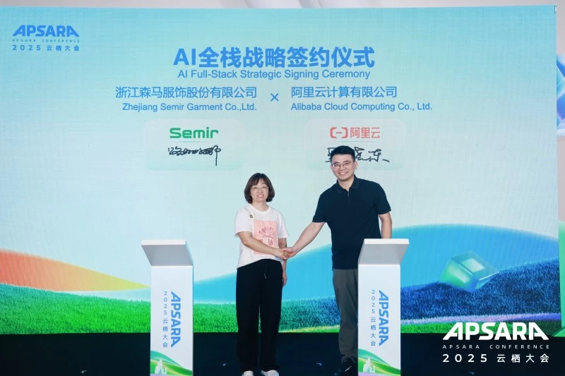 演讲结束后,森马与阿里云举行了“AI全栈战略签约仪式”,标志着双方合作进入新阶段。这一战略合作将覆盖从基础设施到应用场景的全栈AI能力建设,为森马的数字化变革提供更强有力的技术支撑。此次签约标志着双方合作从单一项目向全面生态合作升级。根据协议,阿里云将为森马提供全方位的AI技术支持,包括算力资源、模型训练、平台架构、应用联合开发等,共同推进服饰行业数字化转型。