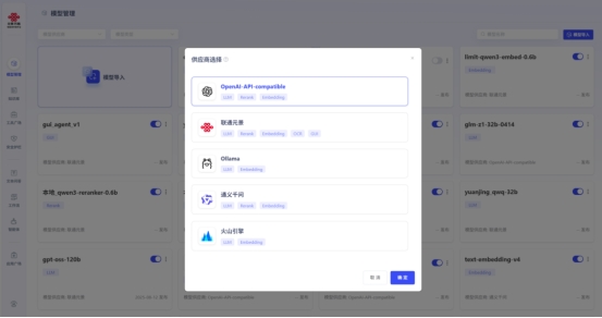 模型导入类别新增OCR模型及GUI模型。目前平台已支持包括OpenAI-API-compatible、联通元景、Ollama、通义千问、火山引擎(豆包)等多个开源模型,覆盖LLM、Embedding、Rerank、OCR、GUI等全类型模型,实现异构模型的无缝切换与统一调度,为企业提供灵活的模型选择空间。