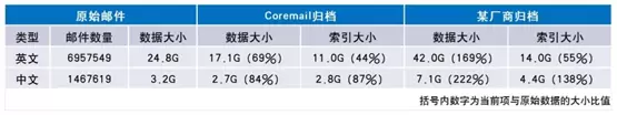 且经过测试发现,将相同的邮件数据导入归档系统,Coremail邮件归档模块通过CRC去重和分块压缩技术,有效降低了邮件数据占用空间。而导入某厂商归档产品后,存储占用相比原始数据均进行了放大,整体占用甚至达到了Coremail归档的两倍以上,很大程度上浪费了存储空间,更进一步提高了其按容量结算的价格。