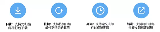 Coremail邮件归档模块支持将系统备份的历史邮件一键还原,包括对归档邮件打包下载、恢复邮件到指定邮箱、定义邮件的保留期限、将归档邮件转发到指定邮箱等多种操作方式,保障资料交接不断档,业务连续不影响。
