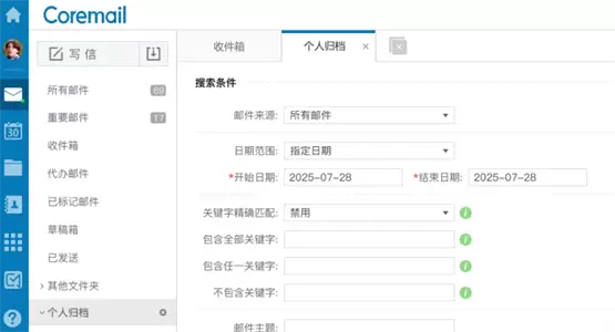 Coremail邮件归档模块强大的搜索引擎,通过设置搜索条件,在海量数据中快速查找,精准定位到与之相关的邮件,保障数据易用性,提高审计员的审计效率。