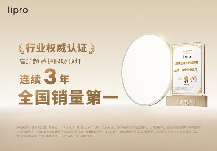 2025年10月13日,lipro凭借高端超薄护眼吸顶灯,获得由国内知名咨询机构尚普咨询集团颁发的《市场地位声明书》,被权威认证为「连续三年全国销量第一」。