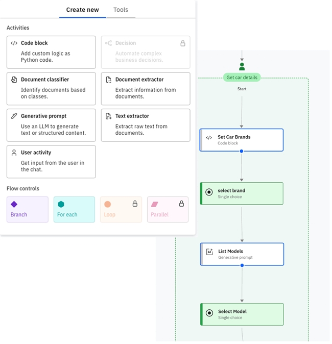 AI 智能体的运行关键在于其行动自主性。随着准确性、合规性和可重复性愈发重要,自主性需要结构化的工作流。watsonx Orchestrate的智能体工作流通过与 Langflow 的集成,帮助用户实现复杂流程的设计、可视化和管理,包括: