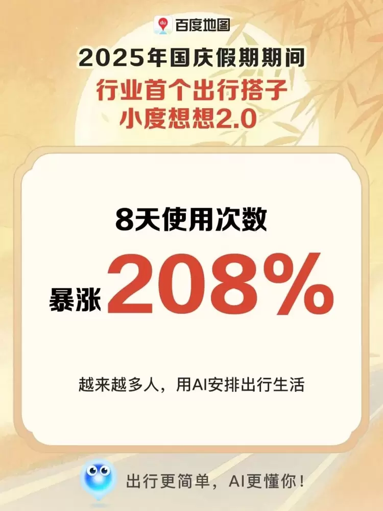 另外,从百度地图官方发布的海报可以看到,这个假期小度想想2.0确实火了一把——短短八天使用次数比节前上涨了208%,越来越多的人开始习惯用AI来安排自己的出行生活。