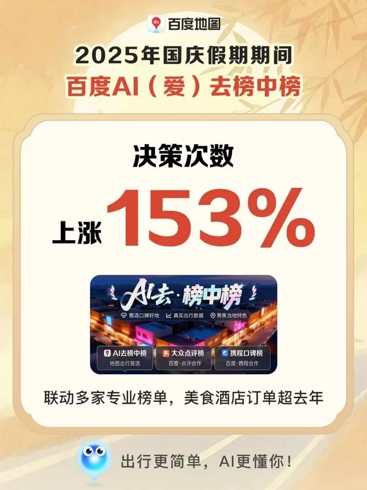 值得一提的是,国庆期间,AI(爱)去榜中榜的决策次数对比节前上涨153%,百度AI去榜中榜、携程口碑榜、点评必吃榜等多个专业榜单带动百度地图国庆期间美食、酒店等服务快速上涨,交易订单量均大幅超去年同期。