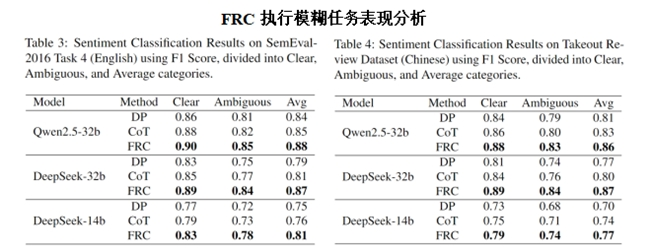 为了验证 FRC模糊思维链方法有效性,中国联通数据科学与人工智能研究院在多个主流基础大模型上,针对多场景复杂任务开展了全面评估。以情感分析为例,当用户表达模糊情况下,FRC模糊思维链的准确率显著优于传统方法。例如,在 DeepSeek-32b 模型上,FRC模糊思维链对英文场景的准确率相较于传统CoT提升约7%,对于中文场景提升约 8%,由此可知FRC模糊思维链能显著提升模型处理复杂场景问题的精细度。