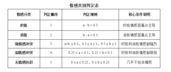 (注:设定a = 积极情感匹配度,b = 消极情感匹配度,a, bϵ[0, 1]。据人工经验显示,|a-b| > 0.3时,大模型容易判定情感分类为积极or消极。而当|a-b| ≤ 0.3 时大模型则难辨情感倾向,会统一判别为中立。因此|a-b|≤ 0.3 的阈值进一步细分为三类:以0.5、0.25为界,区分强冲突、弱冲突和无情感色彩。)