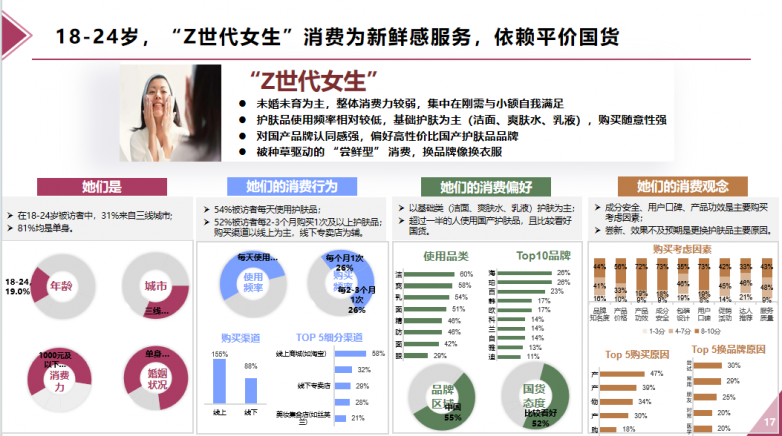 1、从产品升级维度来看,国产护肤品在成分、理念、技术、功效四大维度正经历系统性升级。在成分方面,头部国货品牌通过自主研发专利成分,打破"国产成分落后"的固有印象;在理念方面,通过深挖东方护肤智慧,形成独特品牌文化以提升辨识度;在技术方面,通过加大研发投入,提升成分提取效率与功效稳定性;在功效方面,针对国人肤质精准研发,让产品在保湿、抗衰等核心功效上更具针对性和实效性。