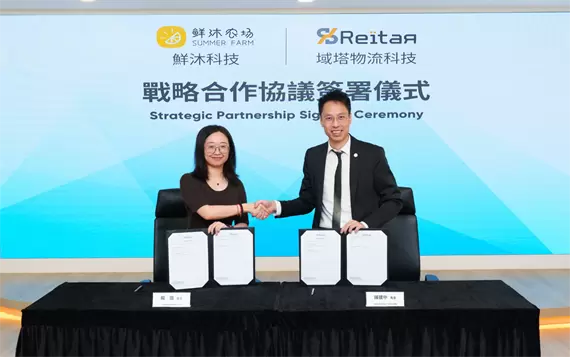 鲜沐科技COO杨晗女士(左)与域塔物流科技集团的主席兼行政总裁陈建中先生(右)