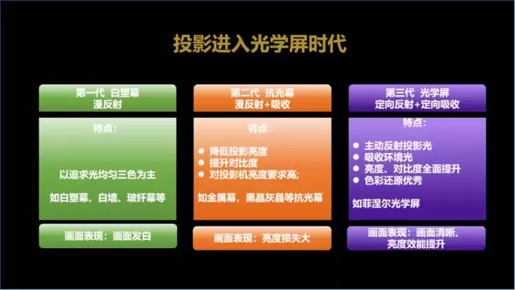 如今,这块屏幕从2015年刚开始的0.8增益,不断提高,到如今最高达到2.8,还具备良好的可视角度和越来越高的环境光遮蔽率,实现技术的全面精进。 光学性能提升的同时,屏幕形态从单一硬屏,发展到全折叠框架,电动升降等多种形态。产品尺寸也从100吋,至110、120吋,再如今150英寸的突破,推动激光投影显示的不断进步。