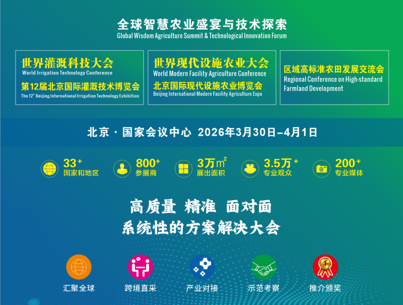 服务乡村振兴与农业现代化战略,夯实粮食安全根基,一场聚焦全球农业科技前沿的权威盛会将于2026年春季在北京启幕。作为推动科技兴农、促进国际产业合作的关键平台,世界灌溉科技大会暨第12届北京国际灌溉技术博览会、世界现代设施农业大会暨北京国际现代设施农业博览会、区域高标准农田发展交流会,定于2026年3月30日至4月1日在北京·国家会议中心举办。