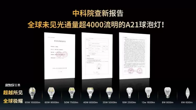 此前,经中国科学院上海科技查新中心报告显示,全球未见光通量超4000流明的A21球泡灯,如今三思发布超4000流明的小体积陶瓷球泡灯系列,标志着我国在LED照明领域实现重大技术突破。