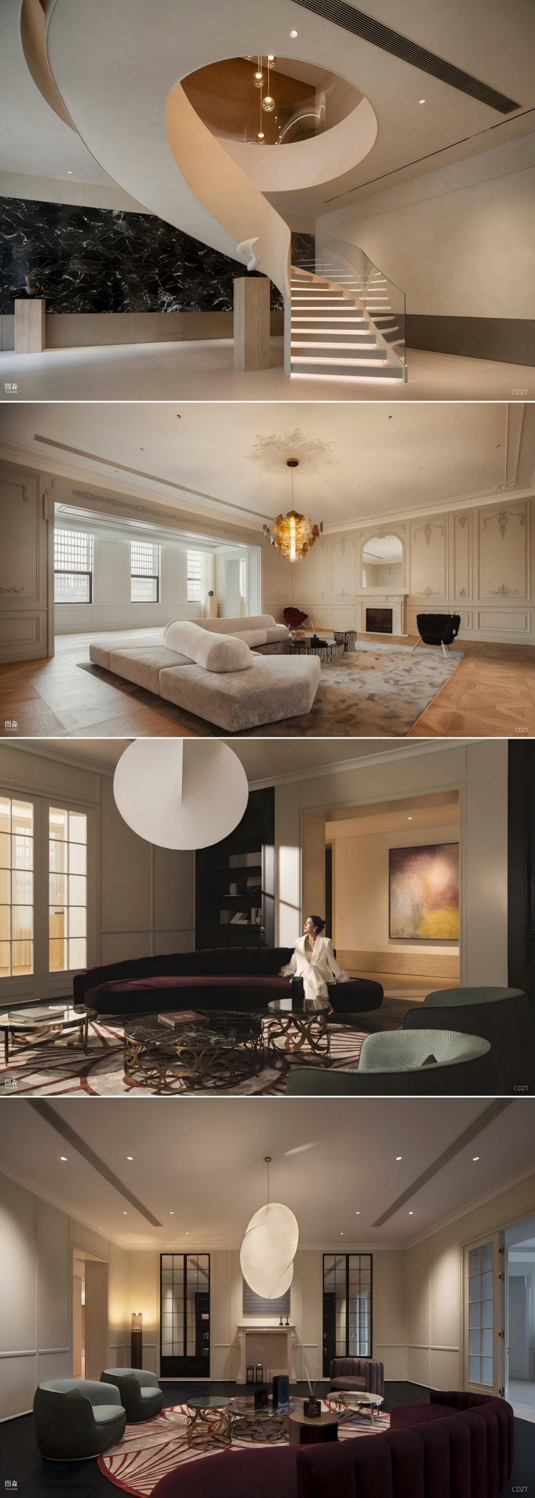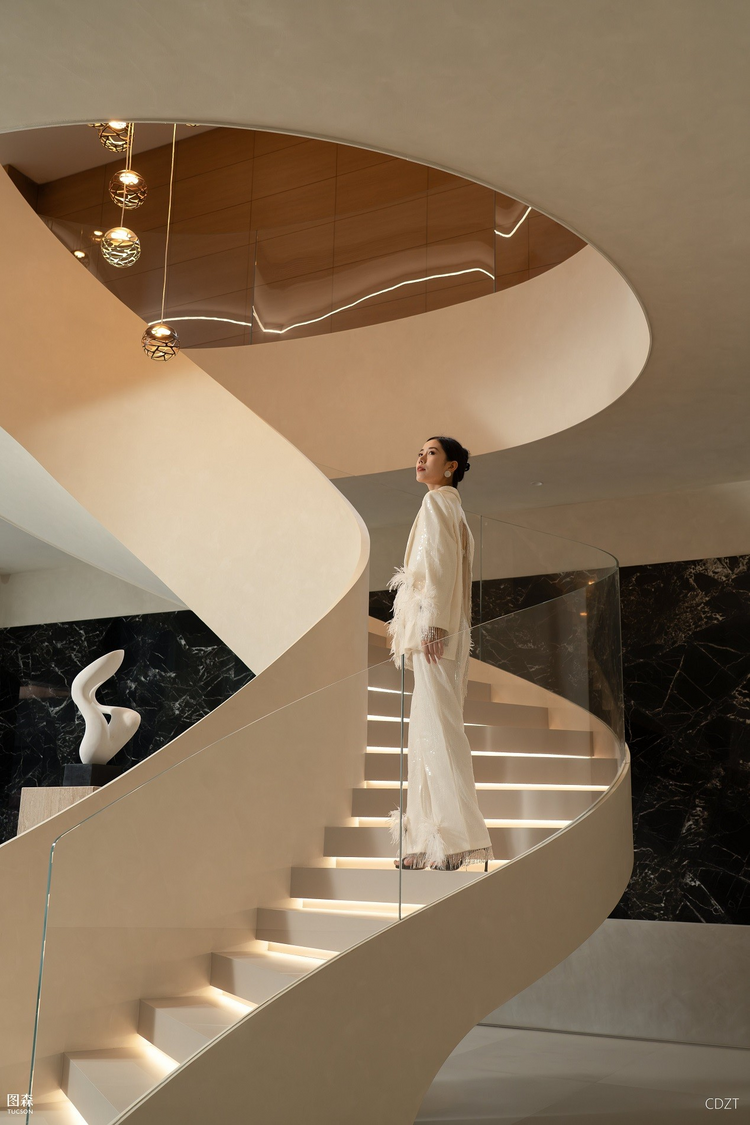 功能与雕塑合一的场域,流动的曲线挑战重力,在旋转中构成轻盈而有力的精神性装置。踏步、扶手、支撑结构被简化的同时,以精密工艺实现高级的平衡。隐藏式灯带勾勒出结构的轮廓,从阶梯间隙洒落,营造出戏剧性的光影叙事。这里不仅是垂直动线,更是一场空间艺术的沉浸体验,展现出高定美学设计对生活品质、技术与仪式感的极致追求。