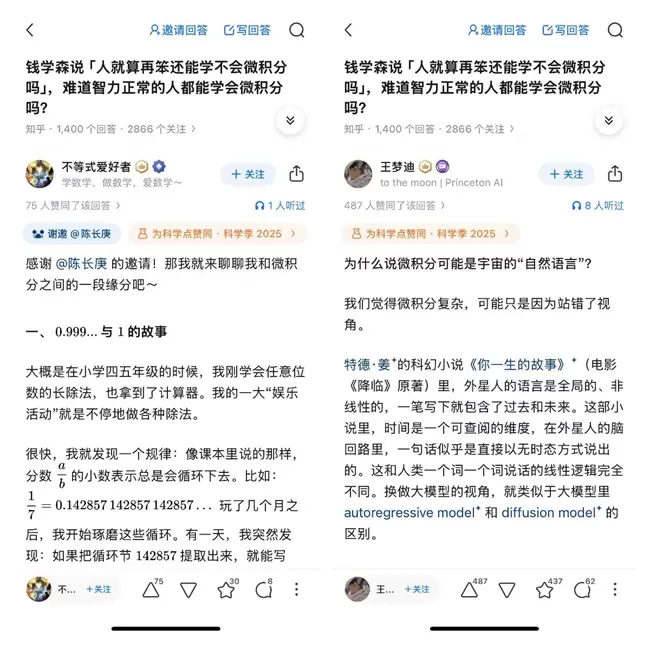 “人就算再笨,还能学不会微积分吗?”上世纪,科学巨擘钱学森的这句疑问,在当下互联网世界再度 “翻红”,掀起一场关于科学认知与学习边界的深度讨论。近期,这一话题不仅吸引了马骁、王梦迪等海内外顶尖青年学者参与,更汇聚了知乎数学领域答主与普通网友的智慧,共同打造出一场跨越代际、兼具学术深度与大众趣味的思想对话。