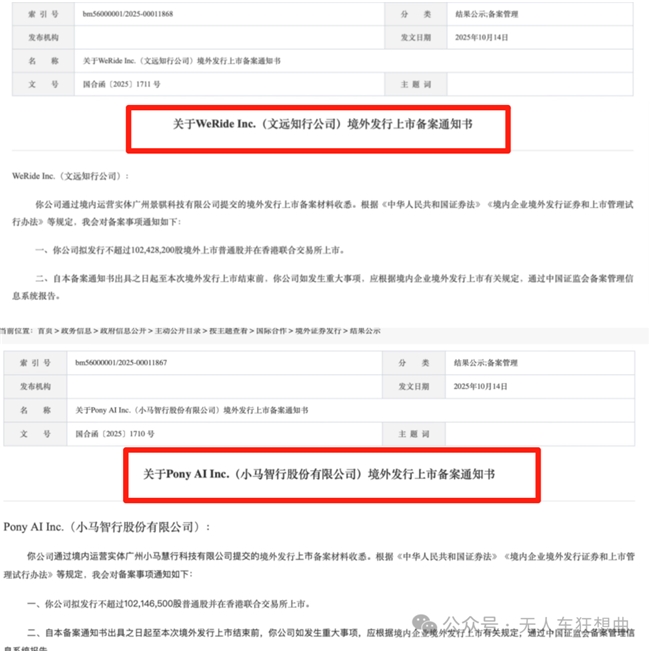 “全球Robotaxi第一股”的争夺战骤然升温。10月14日,文远知行和小马智行同步获得中国证监会的“境外上市备案通知书”,双双拿到港股入场券,计划发行不超过约1.02亿股普通股。