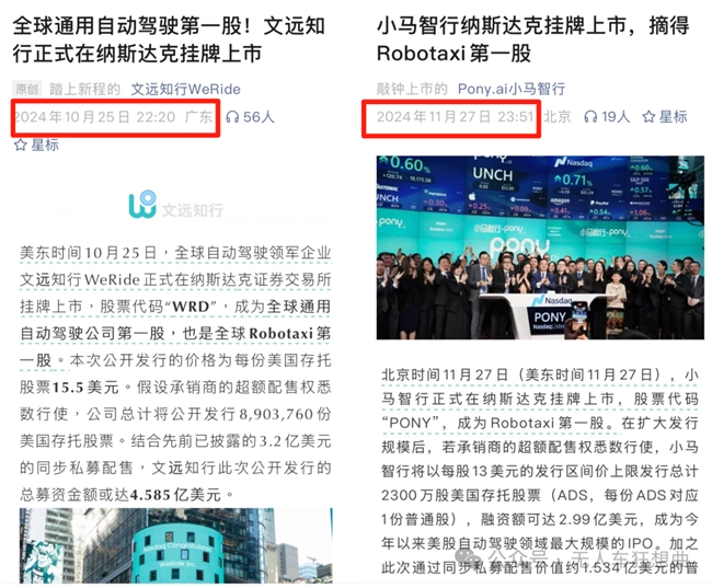 一纸公告,却让一场悬而未决的“名分”之争再度摆上台面——在紧锣密鼓的上市预热中,两家公司不约而同地以“全球Robotaxi第一股”自我标榜,令市场一时难辨虚实。事实上,这场争议的起点,可追溯至2024年。彼时,两家公司先后在纳斯达克上市,也先后在宣传中认领了“全球Robotaxi第一股”的称号,试图在资本市场确立自身的赛道领先地位。然而,“第一”的本质是唯一。资本市场的时钟,从不接受两种时间。