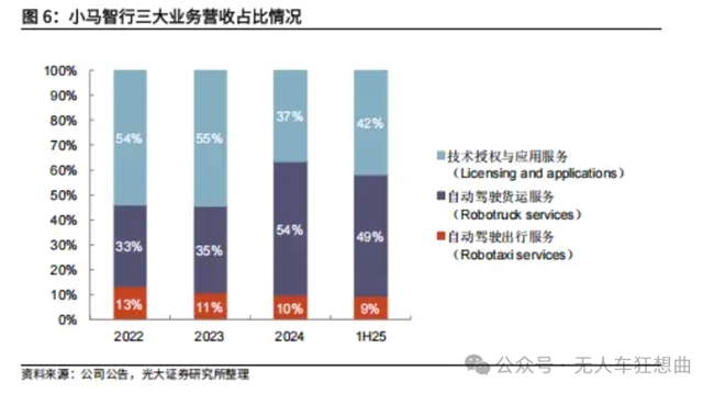 但从实际营收来看,小马智行的Robotaxi收入相比文远知行仍有很大差距,所谓主攻方向的判断或许也不太成立。光大证券研报指出,2025年上半年,自动驾驶货运业务占小马智行整体收入的49%,是重要支柱,而Robotaxi业务占比仅为9%。
