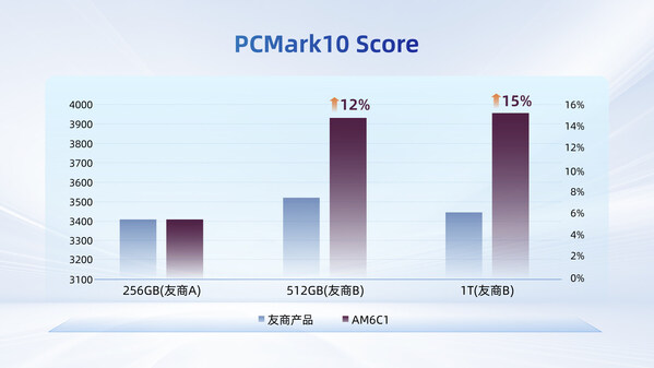 在PCMark 10测试中,AM6C1的512GB与1TB版本得分均突破3900,较友商B同类产品领先10%以上;其256GB版本的表现亦与友商A的同级产品相当。
