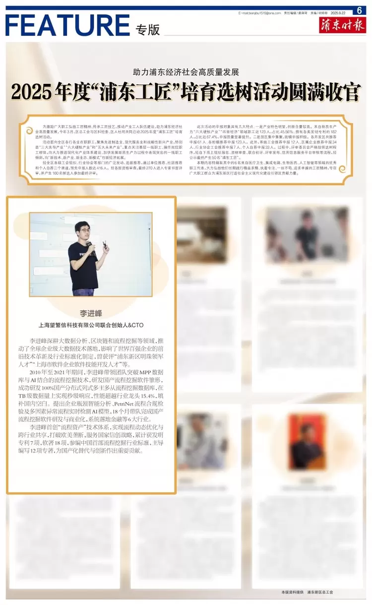 在创新浪潮奔涌的浦东,一批敢于探索、坚守匠心的科技人才,正用技术推动产业向“新”而行。近日,上海望繁信科技有限公司联合创始人兼CTO李进峰,荣获2025年度“浦东工匠”称号,并作为人工智能与流程智能领域代表,接受《浦东时报》专题报道。