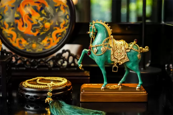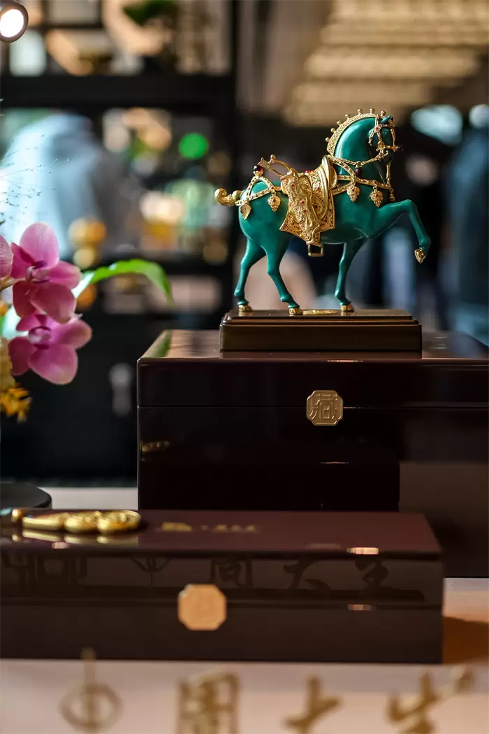 发布会选址别具匠心,西安唐华华邑酒店以盛唐气象与马文化为主题,店内陈列的五花马青铜雕塑、马主题壁画等艺术珍品,与《马到功成》新品形成跨越时空的对话。作为丝绸之路的起点,西安凭借深厚的马文化底蕴,为此次发布注入了独特的历史厚重感,促进了传统文脉与当代审美的自然交融。