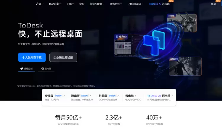 科技解放生产力,2K240帧的远程操作体验正悄然刷新着行业标准,通过跨系统跨设备的远程控制,ToDesk正重新定义数字时代的办公方式。作为国内远程控制领域的领航者,ToDesk上线四年间已服务超过2.3亿台设备,成为众多个人用户和企业组织的首选远程解决方案。