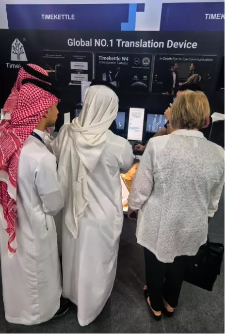 当现场人员向王子介绍“设备翻译延迟稳定控制在3秒内,为业界顶尖水准”时,引得阵阵惊呼,并现场测试体验。王室成员表示这种效率完全能满足实时沟通需求,可以用于各类跨国会议和商旅情况。中东地区与全球各国的经贸、文化往来日益频繁,时空壶的同传技术能有效打破语言壁垒,尤其对推动中东与中国在能源、基建、科技等领域的合作具有重要实用价值,当场称赞“ممتاز”,并表示将持续关注品牌在中东市场的发展。