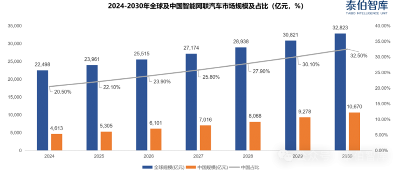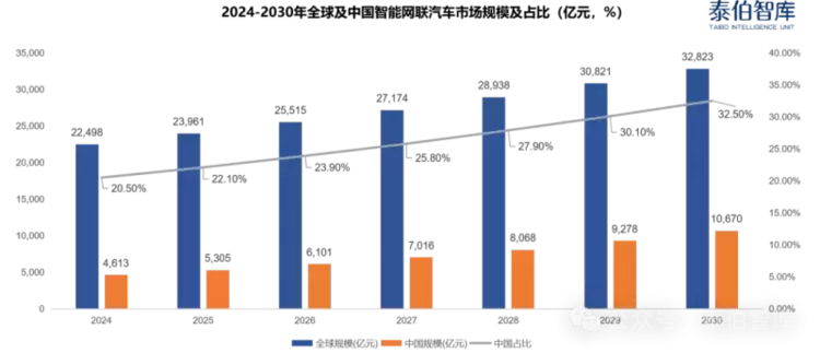 智能化成为差异化竞争关键。随着汽车产业从"电动化"上半场转向"智能化"下半场,中国品牌凭借在智能网联领域的技术积累,正构建新的竞争优势。泰伯研究院预测,全球智能网联汽车市场2025年将达到近2.4万亿元,中国智能网联汽车出海市场规模将在2025年达到5305亿元,并有望在2030年突破1万亿元。