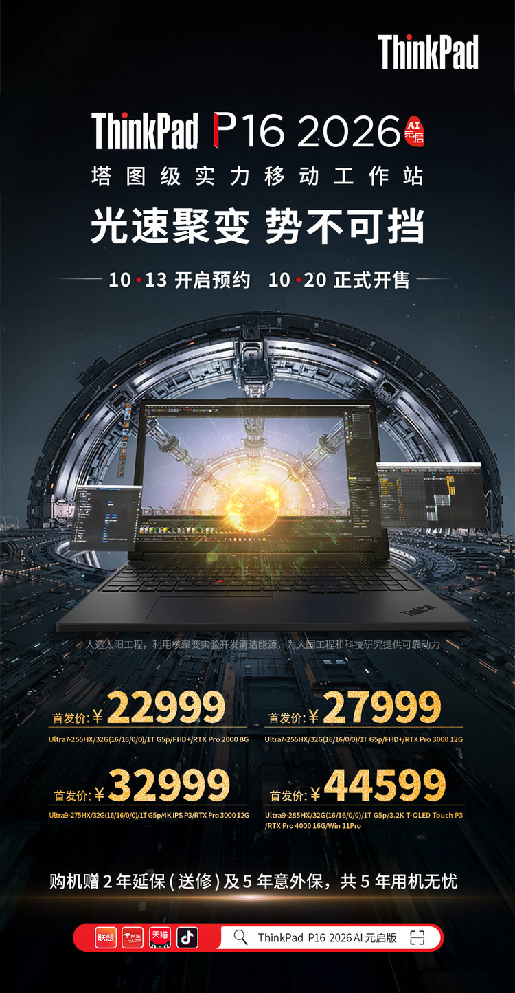 ThinkPad P16 2026 AI元启版现已在联想官网、ThinkPad京东官方旗舰店、ThinkPad天猫官方旗舰店、ThinkPad抖音官方旗舰店正式开售,赠送2年联保及5年意外保。作为当前市场上性能最强劲的移动工作站,ThinkPad P16 2026 AI元启版让用户无论是从事复杂工程设计、高端影视制作还是数据工程计算,都能获得专业、可靠的高效工作体验。