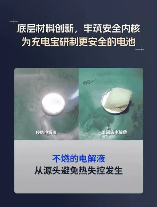 鹏辉能源最新推出的新一代移动电源半固态电池Secu系列,采用不燃电解液打造高安全半固态电池,精准匹配这一价值转变趋势。该电解液材料为鹏辉能源自研的高安全材料专利技术,可实现电解液的原位凝胶化,即使在极端情况下,也能做到不助燃、不自燃,有效避免移动电源电池热失控发生。